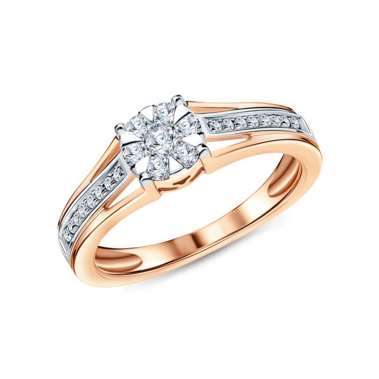 Кольцо с 1 бриллиантом природным, 0.056 карат, огранка круг 57 граней, цвет 3, чистота 6, тип огранки А; 6 бриллиантами природными, 0.111 карат, огранка круг 57 граней, цвет 3, чистота 6, тип огранки А; 16 бриллиантами природными, 0.048 карат, огранка круг 17 граней, цвет 2, чистота 2, тип огранки А; Розовое золото 585 пробы.