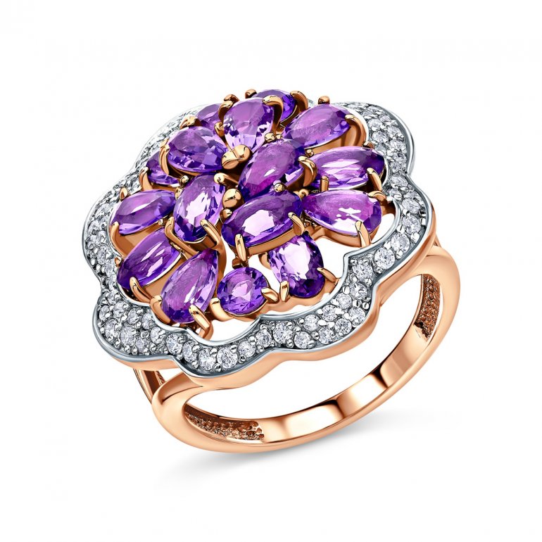 Кольцо с 6 аметистами природными, 1.095 карат, тип огранки Б; 7 аметистами природными, 1.155 карат, тип огранки Б; 3 аметистами природными, 0.33 карат, тип огранки В; фианитом бесцветным; Серебро 925 пробы.