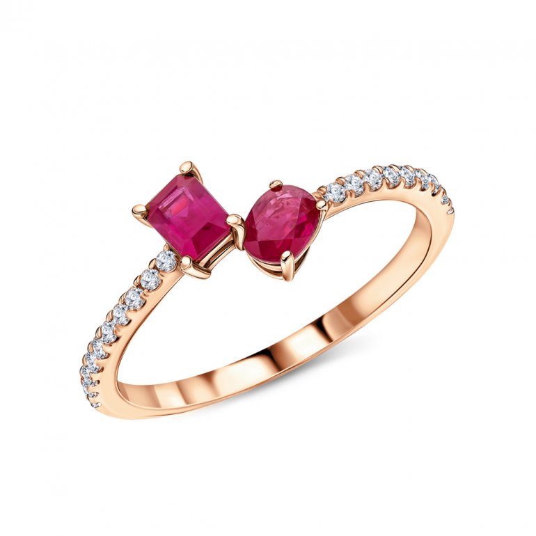 Кольцо с 20 бриллиантами природными, 0.118 карат, огранка круг 17 граней, цвет 2, чистота 3, тип огранки Б; 1 рубином природным, 0.2 карат, цвет 3, чистота 4, тип огранки Б; 1 рубином природным, 0.198 карат, цвет 3, чистота 4, тип огранки Б; Розовое золото 585 пробы.