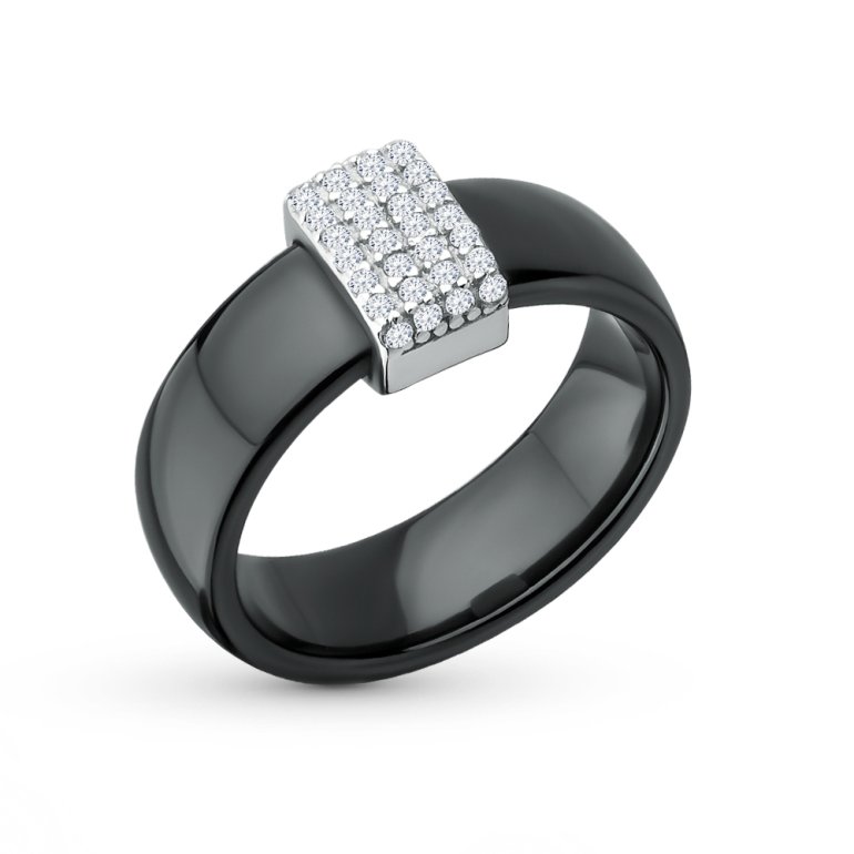 Кольцо, вставка: фианитом бесцветным;  керамика черная; Серебро 925 пробы.