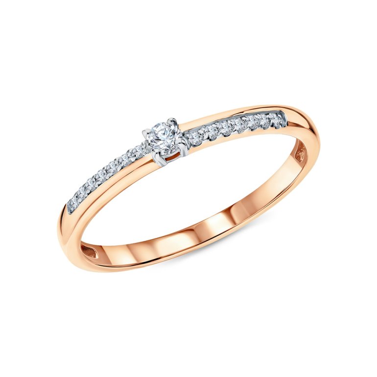 Кольцо с 1 бриллиантом, 0.058 карат, огранка круг 57 граней, цвет 3, чистота 6, тип огранки А; 14 бриллиантами, 0.059 карат, огранка круг 57 граней, цвет 3, чистота 6, тип огранки А; Розовое золото 585 пробы.