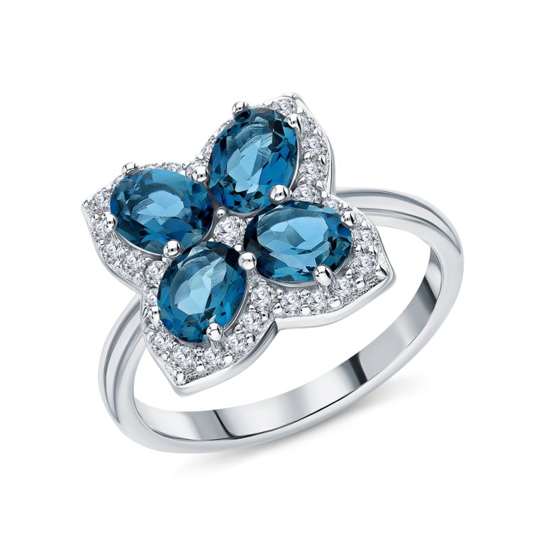 Кольцо с 4 топазами лондон природными, 1.6 карат;  фианитом бесцветным; Серебро 925 пробы.