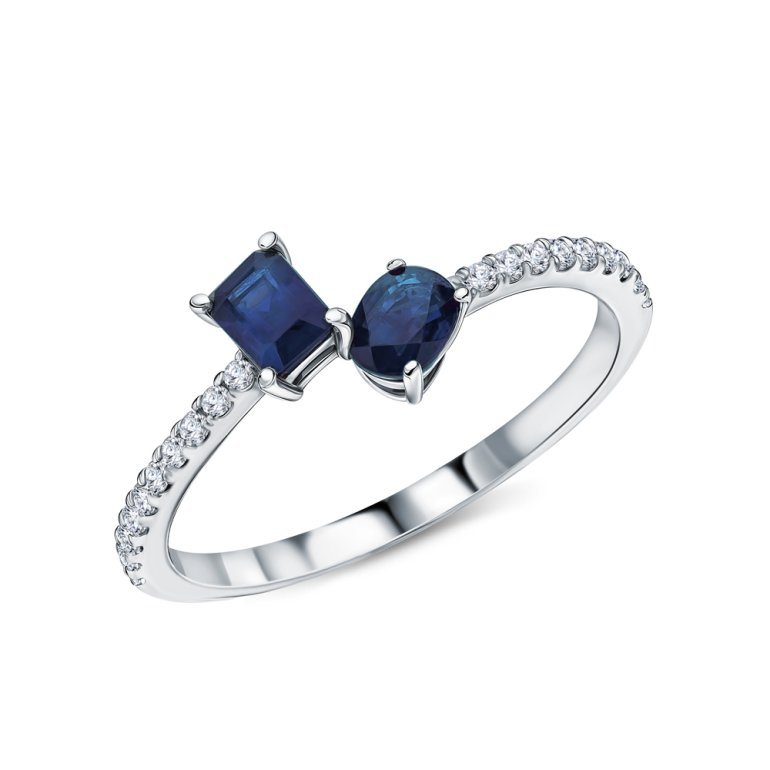 Кольцо с 20 бриллиантами природными, 0.117 карат, огранка круг 17 граней, цвет 2, чистота 3, тип огранки Б; 1 сапфиром природным, 0.261 карат, цвет 3, чистота 4, тип огранки Б; 1 сапфиром природным, 0.231 карат, цвет 3, чистота 4, тип огранки Б; Белое золото 585 пробы.