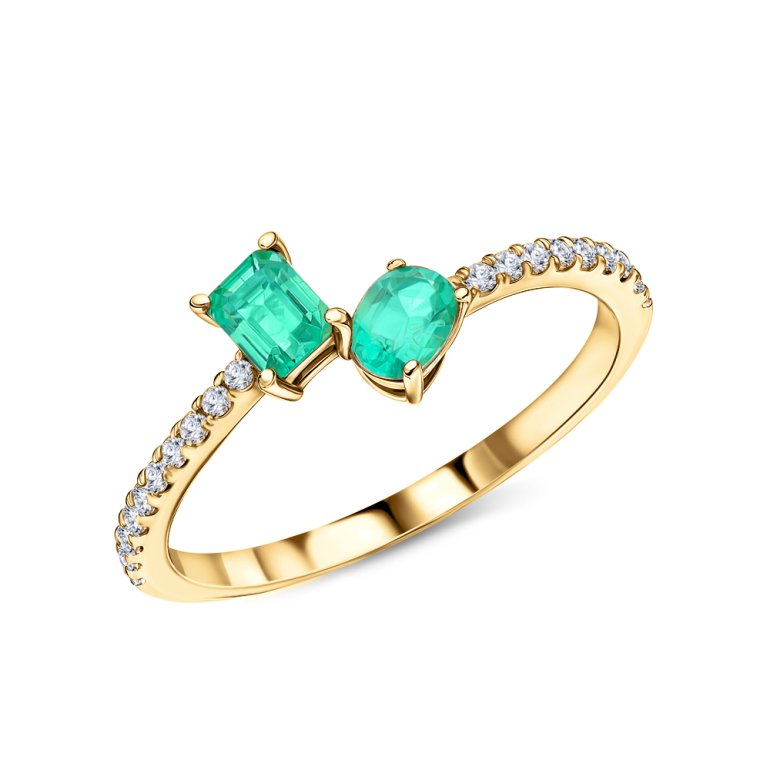 Кольцо с 20 бриллиантами природными, 0.117 карат, огранка круг 17 граней, цвет 2, чистота 3, тип огранки Б; 1 изумрудом природным, 0.195 карат, цвет 4, чистота 3, тип огранки Б; 1 изумрудом природным, 0.141 карат, цвет 4, чистота 3, тип огранки Б; Желтое золото 585 пробы.
