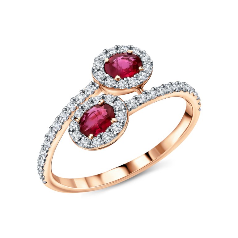 Кольцо с 48 бриллиантами природными, 0.287 карат, огранка круг 17 граней, цвет 2, чистота 3, тип огранки Б; 2 рубинами природными, 0.439 карат, цвет 3, чистота 4, тип огранки Б; Розовое золото 585 пробы.
