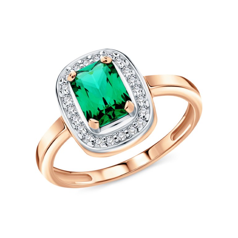 Кольцо, вставка: фианитом бесцветным;  ситалл зеленый; Розовое золото 585 пробы.