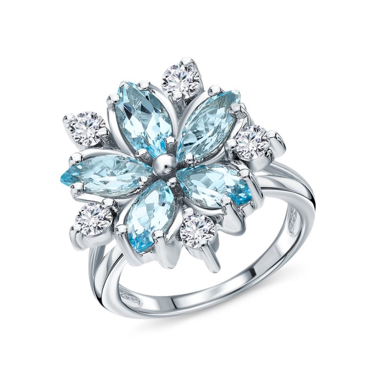 Кольцо с 5 топазами скай природными, 3.1 карат;  фианитом бесцветным; Серебро 925 пробы.