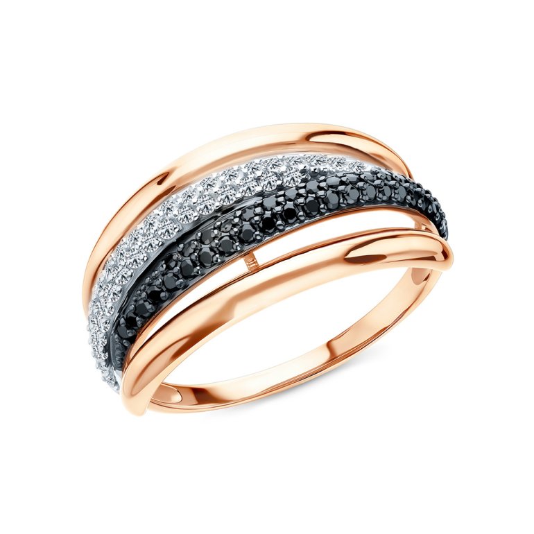 Кольцо с 39 бриллиантами природными, 0.177 карат, огранка круг 17 граней, цвет 2, чистота 2, тип огранки А; 39 бриллиантами черными природными облагороженными, 0.173 карат, огранка круг 57 граней, цвет 7, чистота 6, тип огранки А; Розовое золото 585 пробы.