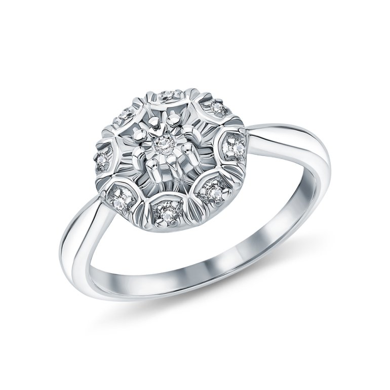 Кольцо с 9 бриллиантами природными, 0.049 карат, огранка круг 17 граней, цвет 2, чистота 4, тип огранки Б; Серебро 925 пробы.