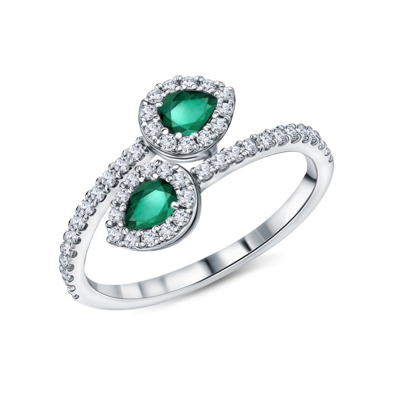Кольцо с 48 бриллиантами природными, 0.284 карат, огранка круг 17 граней, цвет 2, чистота 3, тип огранки Б; 2 изумрудами природными, 0.259 карат, цвет 4, чистота 3, тип огранки Б; Белое золото 585 пробы.