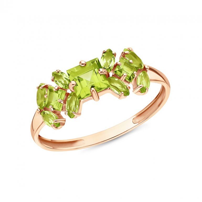 Кольцо с 1 хризолитом, 0.705 карат, тип огранки Б; 2 хризолитами, 0.315 карат, тип огранки Б; 8 хризолитами, 0.665 карат, тип огранки Б; Розовое золото 585 пробы.