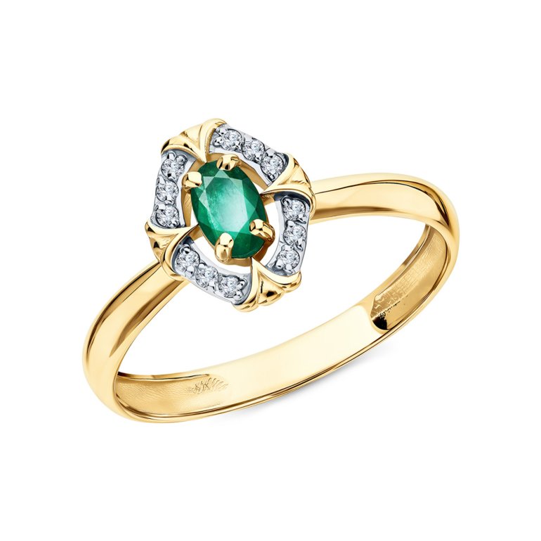 Кольцо с 12 бриллиантами природными, 0.046 карат, огранка круг 57 граней, цвет 4, чистота 5, тип огранки А; 1 изумрудом природным, 0.2 карат, цвет 3, чистота 3, тип огранки Б; Желтое золото 585 пробы.