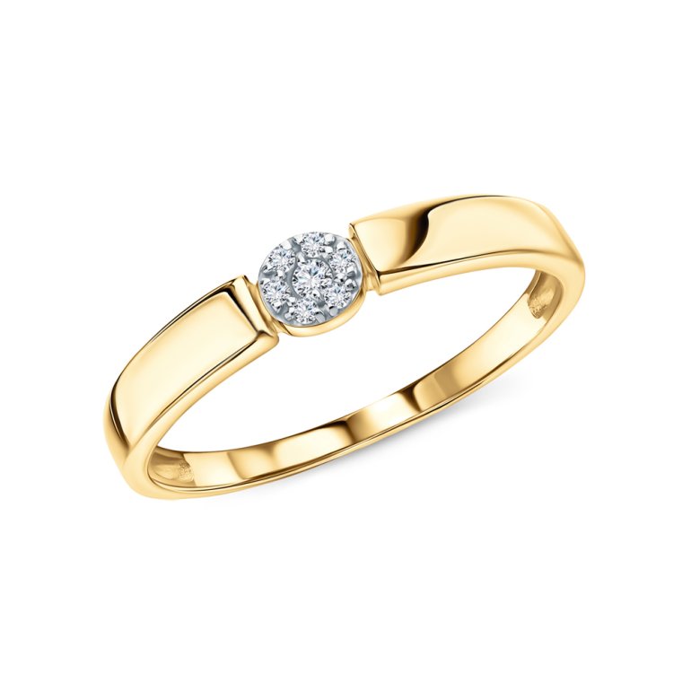 Кольцо с 1 бриллиантом природным, 0.013 карат, огранка круг 57 граней, цвет 3, чистота 6, тип огранки А; 6 бриллиантами природными, 0.025 карат, огранка круг 17 граней, цвет 2, чистота 2, тип огранки А; Желтое золото 585 пробы.