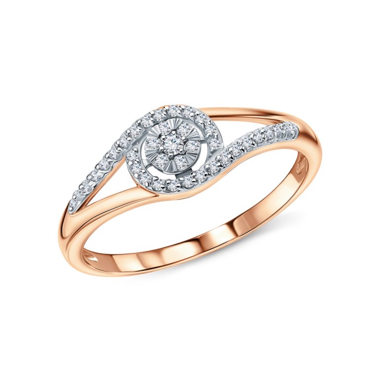 Кольцо с 1 бриллиантом, 0.015 карат, огранка круг 57 граней, цвет 3, чистота 6, тип огранки А; 6 бриллиантами, 0.043 карат, огранка круг 57 граней, цвет 3, чистота 6, тип огранки А; 30 бриллиантами, 0.076 карат, огранка круг 17 граней, цвет 2, чистота 2, тип огранки А; Розовое и белое золото 585 пробы.