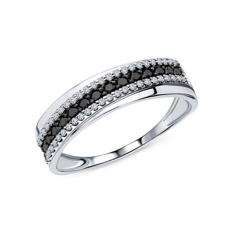 Кольцо с 14 бриллиантами черными облагороженными, 0.193 карат, огранка круг 57 граней, цвет 7, чистота 6, тип огранки А; 48 бриллиантами, 0.121 карат, огранка круг 17 граней, цвет 2, чистота 2, тип огранки А; Белое золото 585 пробы.