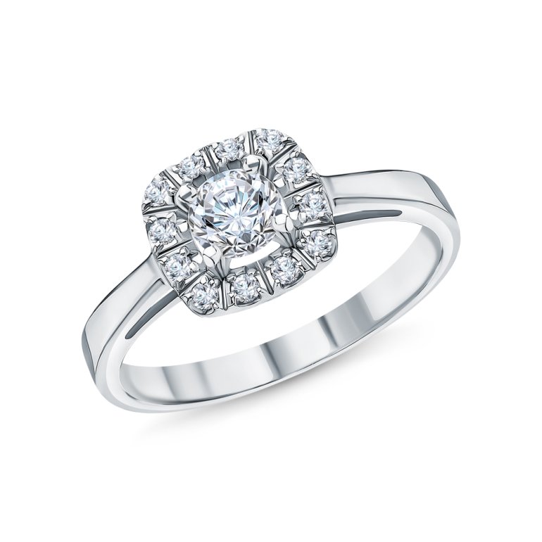 Кольцо с 1 бриллиантом выращенным, 0.316 карат, огранка круг 57 граней, цвет 3, чистота 6, тип огранки А; 12 бриллиантами выращенными, 0.103 карат, огранка круг 57 граней, цвет 3, чистота 5, тип огранки А; Белое золото 585 пробы.