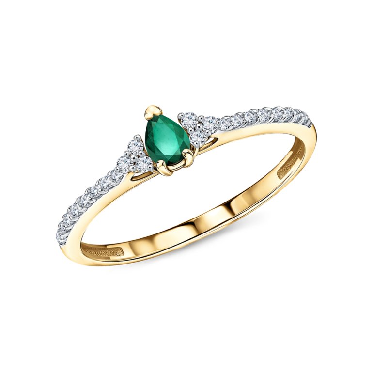 Кольцо с 1 изумрудом природным, 0.125 карат, цвет 3, чистота 3, тип огранки Б; 6 бриллиантами, 0.04 карат, огранка круг 17 граней, цвет 2, чистота 2, тип огранки А; 14 бриллиантами, 0.044 карат, огранка круг 17 граней, цвет 2, чистота 2, тип огранки А; Желтое золото 585 пробы.