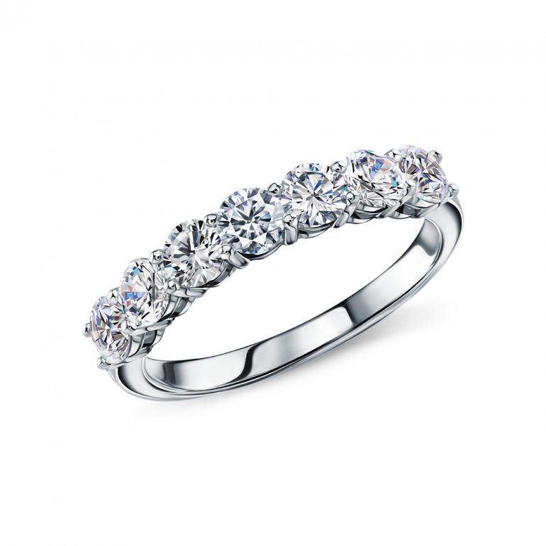 Кольцо с 7 бриллиантами, 0.915 карат, огранка круг 57 граней, цвет 3, чистота 6, тип огранки А; Белое золото 585 пробы.