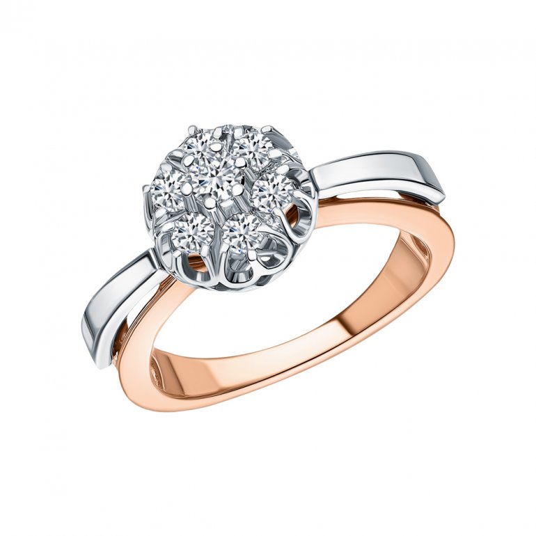 Кольцо с 1 бриллиантом, 0.096 карат, огранка круг 57 граней, цвет 3, чистота 6, тип огранки А; 6 бриллиантами, 0.271 карат, огранка круг 57 граней, цвет 3, чистота 6, тип огранки А; Розовое и белое золото 585 пробы.