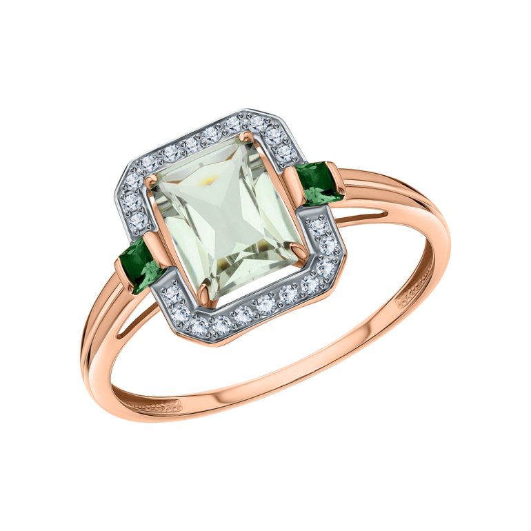 Кольцо с 1 празиолитом природным, 0.94 карат, тип огранки Б; 2 синтетическими зелеными шпинелями, 0.177 карат, тип огранки Б; фианит; Розовое золото 585 пробы.