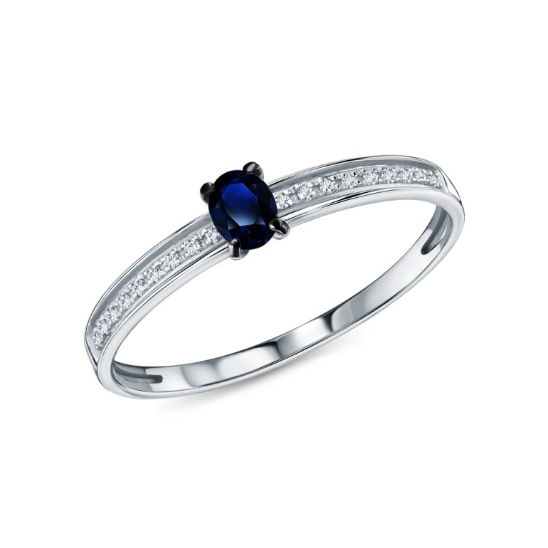 Кольцо с 18 бриллиантами природными, 0.04 карат, огранка круг 17 граней, цвет 2, чистота 2, тип огранки А; 1 сапфиром природным, 0.213 карат, цвет 2, чистота 2, тип огранки Б; Белое золото 585 пробы.