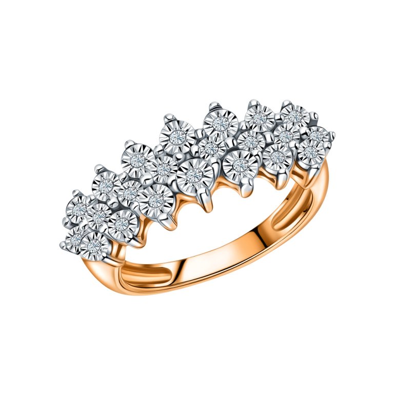 Кольцо с 22 бриллиантами природными, 0.106 карат, огранка круг 17 граней, цвет 2, чистота 2, тип огранки А; Розовое и белое золото 585 пробы.