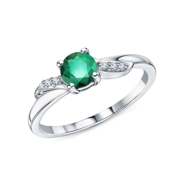 Кольцо с 1 изумрудом природным, 0.476 карат, цвет 4, чистота 3, тип огранки В; фианитом бесцветным; Серебро 925 пробы.
