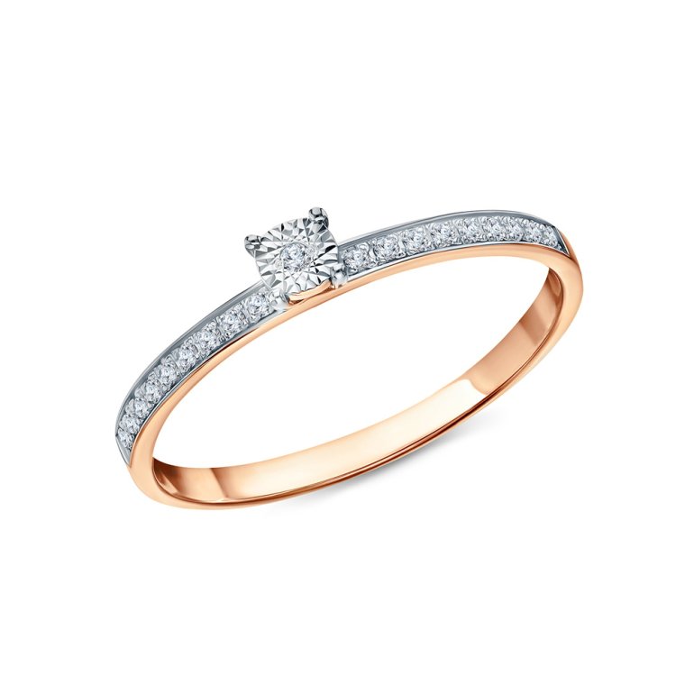 Кольцо с 1 бриллиантом, 0.008 карат, огранка круг 57 граней, цвет 4, чистота 5, тип огранки А; 18 бриллиантами, 0.089 карат, огранка круг 17 граней, цвет 2, чистота 2, тип огранки А; Розовое и белое золото 585 пробы.