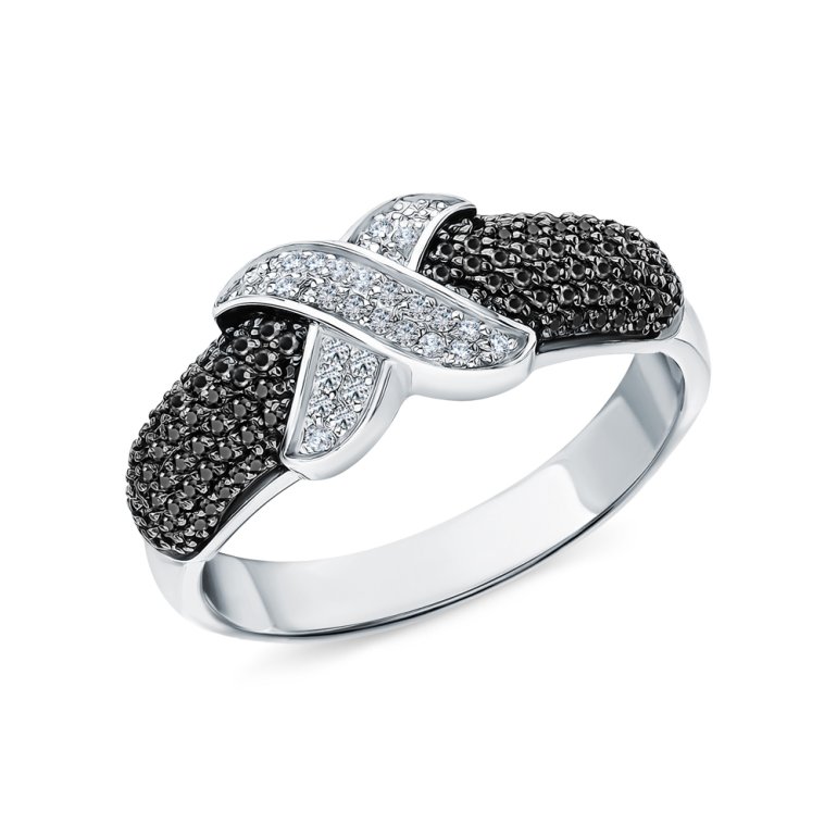 Кольцо с 34 бриллиантами природными, 0.07 карат, огранка круг 17 граней, цвет 2, чистота 2, тип огранки А; 114 бриллиантами черными природными облагороженными, 0.288 карат, огранка круг 57 граней, цвет 7, чистота 6, тип огранки А; Белое золото 585 пробы.