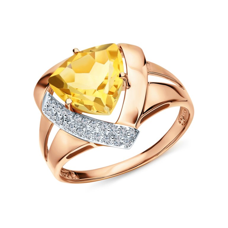 Кольцо с 22 бриллиантами природными, 0.091 карат, огранка круг 17 граней, цвет 2, чистота 2, тип огранки А; 1 цитрином природным, 2.105 карат, тип огранки Б; Розовое золото 585 пробы.