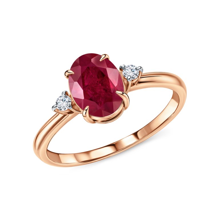 Кольцо с 1 рубином, 1.497 карат, цвет 2, чистота 2, тип огранки Б; 2 бриллиантами, 0.056 карат, огранка круг 57 граней, цвет 3, чистота 6, тип огранки А; Розовое золото 585 пробы.