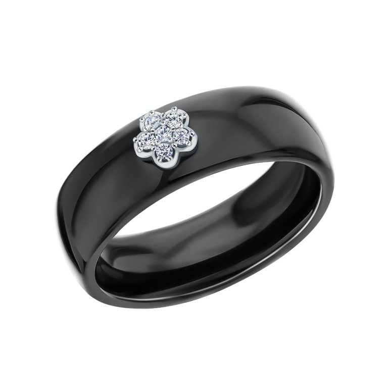 Кольцо, вставка: керамика черная; фианитом бесцветным; элемент из недрагоценного мет.; Сталь