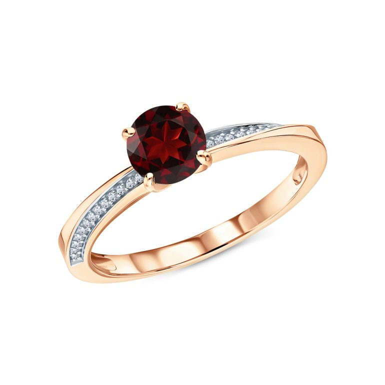 Кольцо с 1 гранатом природным, 1.071 карат, тип огранки В; 26 бриллиантами, 0.048 карат, огранка круг 17 граней, цвет 2, чистота 2, тип огранки А; Розовое золото 585 пробы.