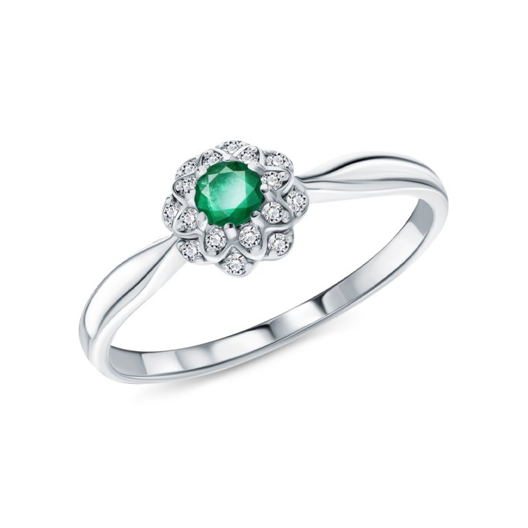 Кольцо с 1 изумрудом природным, 0.099 карат, цвет 3, чистота 3, тип огранки В; фианитом бесцветным; Серебро 925 пробы.