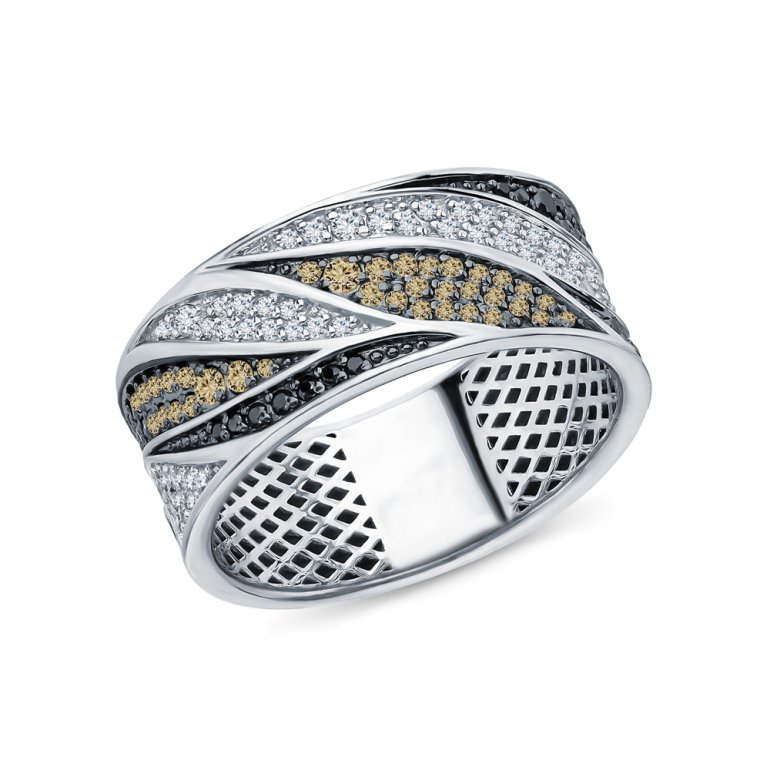 Кольцо с 3 бриллиантами природными, 0.025 карат, огранка круг 57 граней, цвет 3, чистота 6, тип огранки А; 25 бриллиантами природными, 0.103 карат, огранка круг 17 граней, цвет 2, чистота 2, тип огранки А; 29 бриллиантами природными, 0.078 карат, огранка круг 17 граней, цвет 2, чистота 2, тип огранки А; 2 бриллиантами черными природными облагороженными, 0.023 карат, огранка круг 57 граней, цвет 7, чистота 6, тип огранки А; 3 бриллиантами коньячными природными, 0.033 карат, огранка круг 57 граней, цвет 7, чистота 5, тип огранки А; 1 бриллиантом коньячным природным, 0.009 карат, огранка круг 57 граней, цвет 7, чистота 5, тип огранки А; 5 бриллиантами черными природными облагороженными, 0.022 карат, огранка круг 57 граней, цвет 7, чистота 6, тип огранки А; 17 бриллиантами коньячными природными, 0.06 карат, огранка круг 57 граней, цвет 7, чистота 5, тип огранки А; 28 бриллиантами черными природными облагороженными, 0.084 карат, огранка круг 57 граней, цвет 7, чистота 6, тип огранки