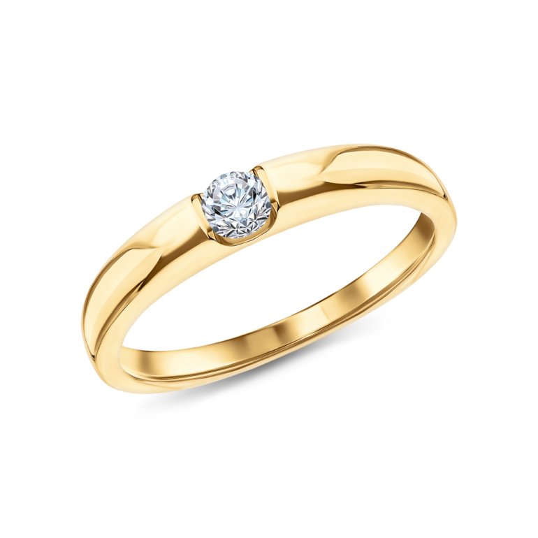 Кольцо с 1 бриллиантом, 0.13 карат, огранка круг 57 граней, цвет 3, чистота 6, тип огранки А; Желтое золото 585 пробы.