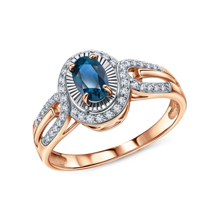 Кольцо с 1 топазом лондон, 0.54 карат, тип огранки Б; 42 бриллиантами, 0.176 карат, огранка круг 17 граней, цвет 2, чистота 2, тип огранки Б; Розовое золото 585 пробы.