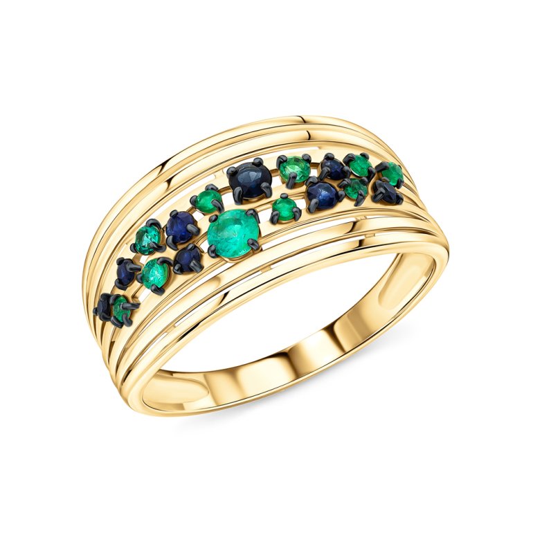 Кольцо с 1 изумрудом природным, 0.062 карат, цвет 3, чистота 3, тип огранки В; 1 сапфиром природным, 0.034 карат, цвет 2, чистота 2, тип огранки В; 2 сапфирами природными, 0.037 карат, цвет 2, чистота 2, тип огранки В; 3 изумрудами природными, 0.039 карат, цвет 3, чистота 3, тип огранки В; 5 сапфирами природными, 0.06 карат, цвет 2, чистота 2, тип огранки В; 6 изумрудами природными, 0.049 карат, цвет 3, чистота 3, тип огранки В; Желтое золото 585 пробы.