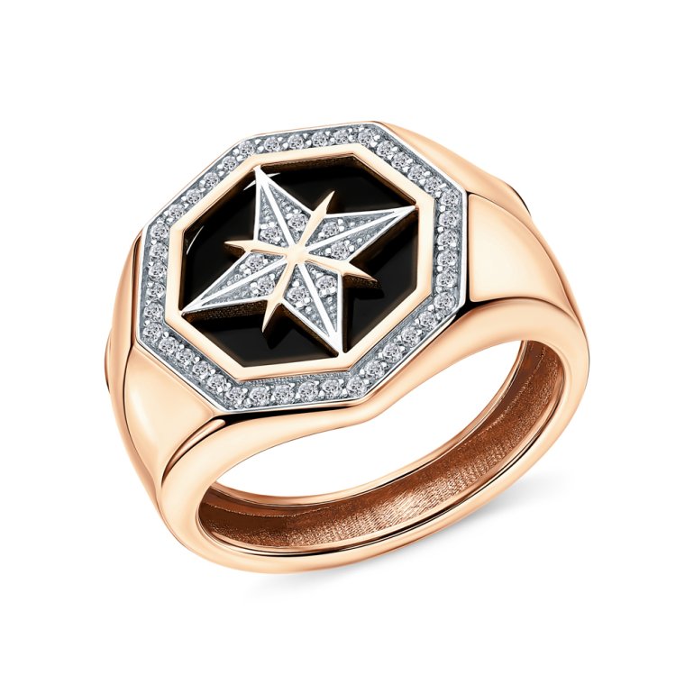 Кольцо с 1 ониксом черным природным, 2.51 карат, тип огранки В; фианитом бесцветным; Розовое золото 585 пробы.