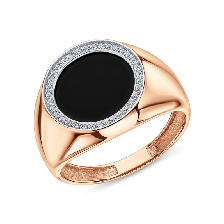 Кольцо с 1 ониксом черным природным, 2.5 карат, тип огранки В; фианитом бесцветным; Розовое золото 585 пробы.