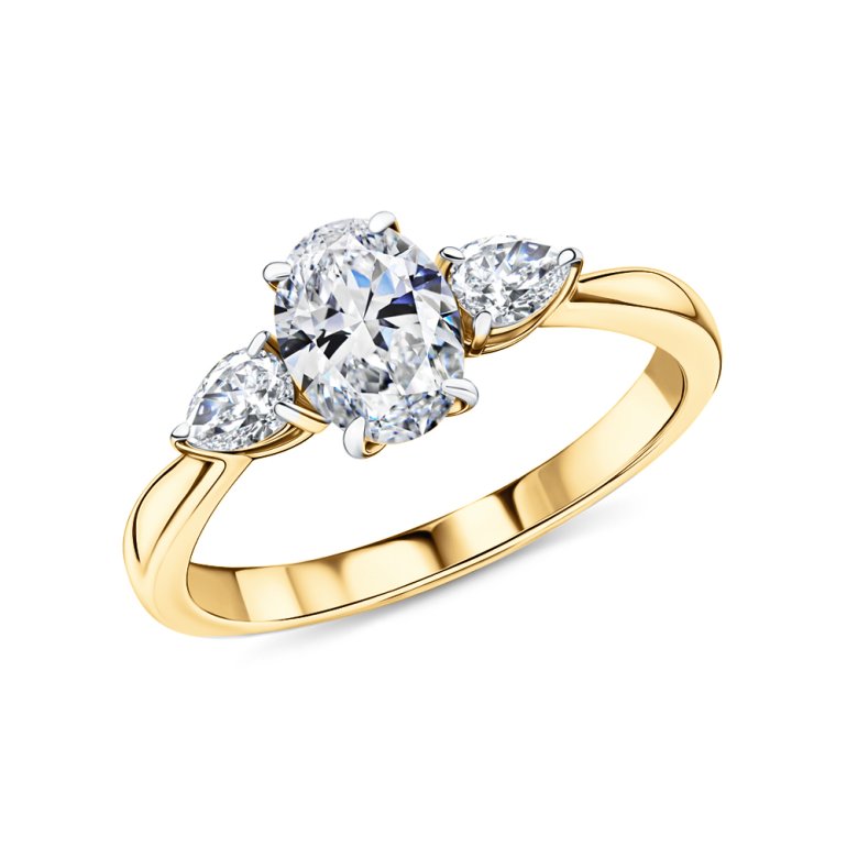 Кольцо с 1 бриллиантом выращенным, 0.93 карат, огранка овал 57 граней, цвет 3, чистота 5, тип огранки А; 2 бриллиантами выращенными, 0.288 карат, огранка груша 56 граней, цвет 2, чистота 5, тип огранки А; Желтое золото 585 пробы.