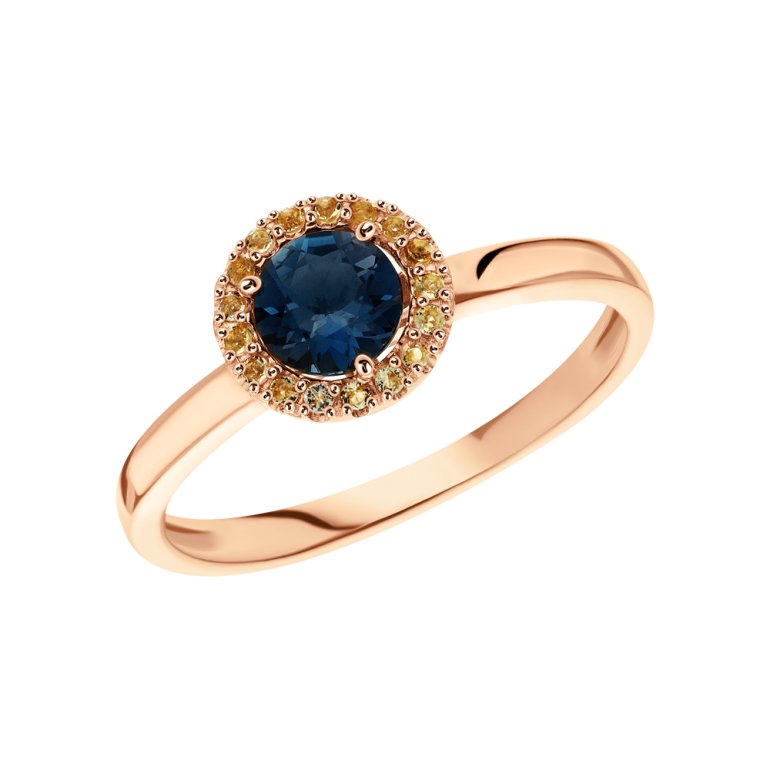 Кольцо с 1 топазом лондон природным, 0.591 карат, тип огранки В; 17 цитринами природными, 0.075 карат, тип огранки В; Розовое золото 585 пробы.