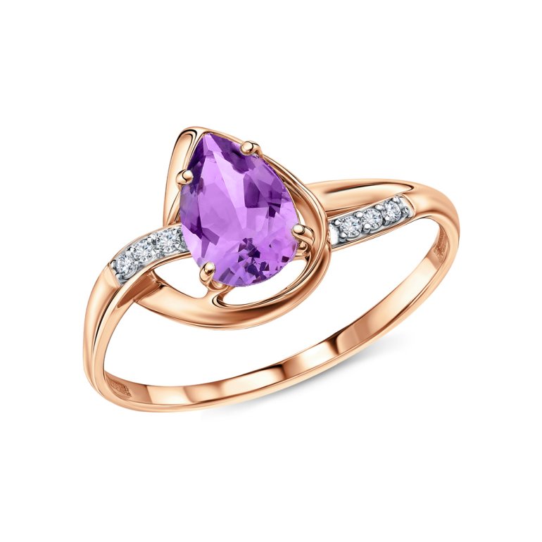 Кольцо с 1 аметистом, 1.15 карат, тип огранки Б; 6 бриллиантами, 0.043 карат, огранка круг 57 граней, цвет 3, чистота 6, тип огранки А; Розовое золото 585 пробы.
