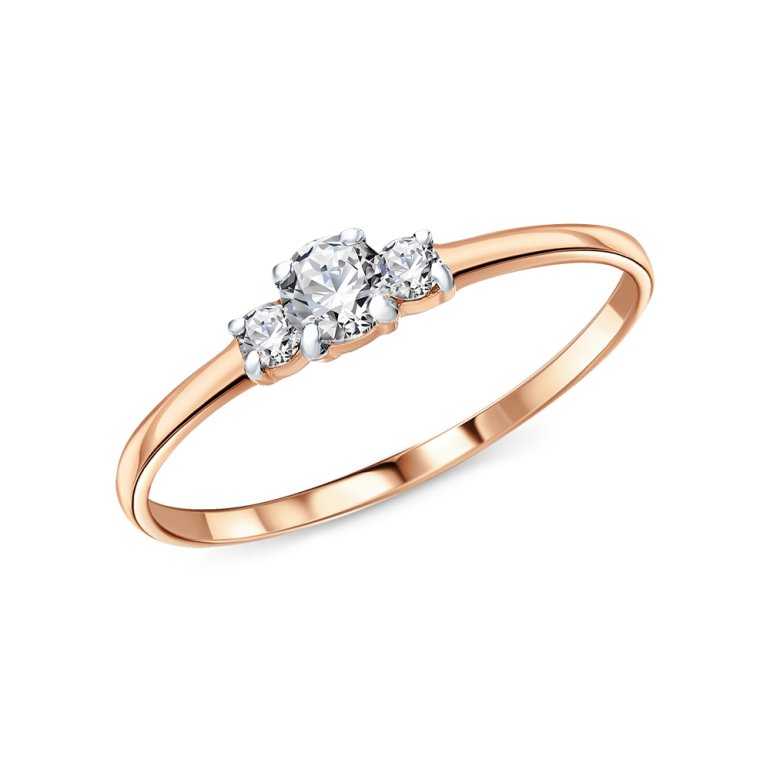 Кольцо с 1 фианитом бесцветным, 0.193 карат, тип огранки Б; 2 фианитами бесцветными, 0.071 карат, тип огранки Б; Розовое золото 585 пробы.
