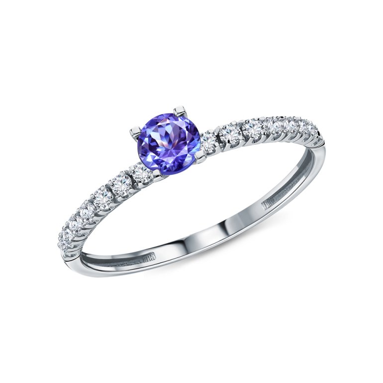 Кольцо с 1 танзанитом, 0.516 карат, тип огранки В; 14 бриллиантами, 0.307 карат, огранка круг 57 граней, цвет 4, чистота 5, тип огранки А; Белое золото 585 пробы.