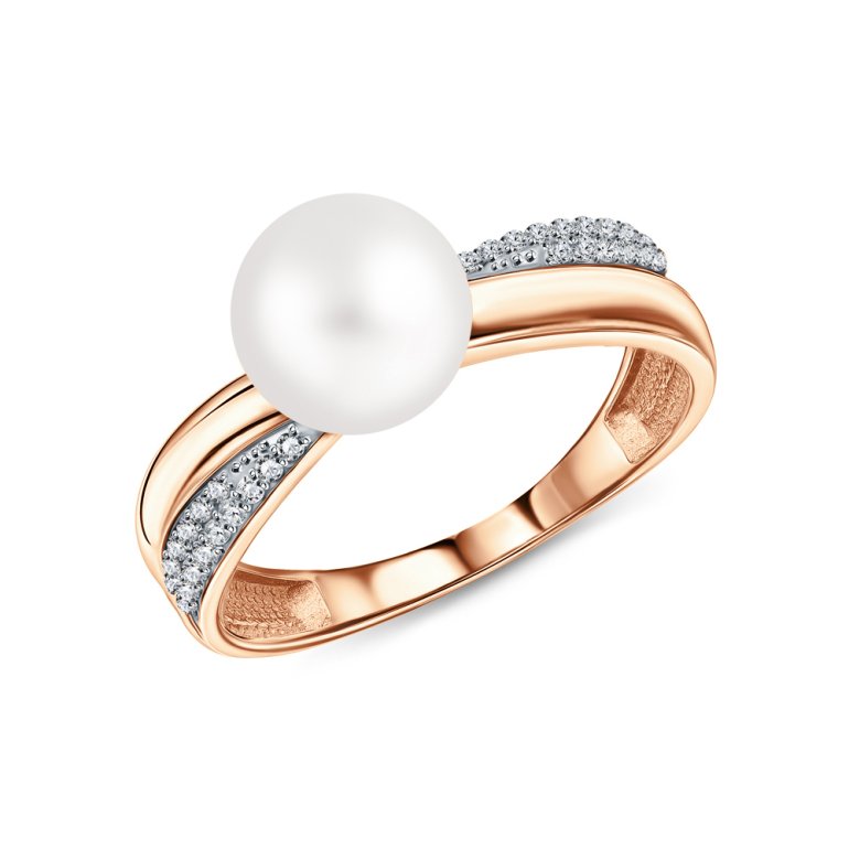 Кольцо с 1 жемчугом пресноводным культивированным белым;  фианитом бесцветным; Розовое золото 585 пробы.