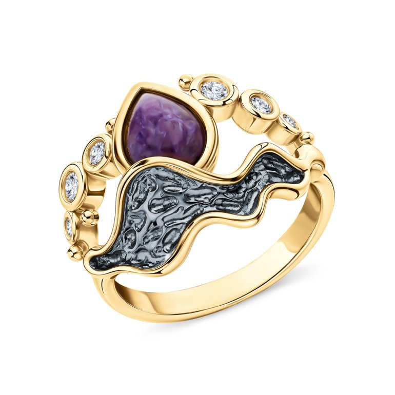 Кольцо с 1 чароитом; фианитом бесцветным; Серебро 925 пробы.