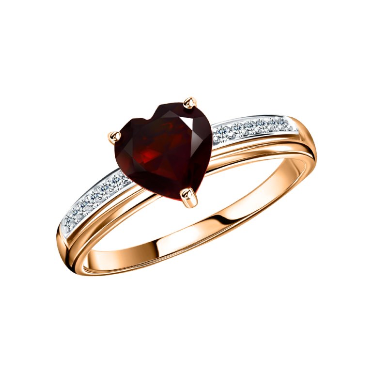 Кольцо с 1 гранатом, 1.431 карат, тип огранки Б; 14 бриллиантами, 0.058 карат, огранка круг 17 граней, цвет 2, чистота 2, тип огранки А; Розовое золото 585 пробы.