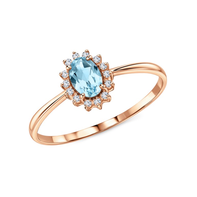 Кольцо с 1 топазом скай природным, 0.555 карат, тип огранки Б; 14 бриллиантами, 0.069 карат, огранка круг 17 граней, цвет 2, чистота 2, тип огранки А; Розовое золото 585 пробы.