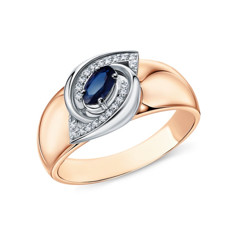 Кольцо с 22 бриллиантами природными, 0.047 карат, огранка круг 17 граней, цвет 2, чистота 2, тип огранки А; 1 сапфиром природным, 0.281 карат, цвет 2, чистота 2, тип огранки Б; Розовое и белое золото 585 пробы.